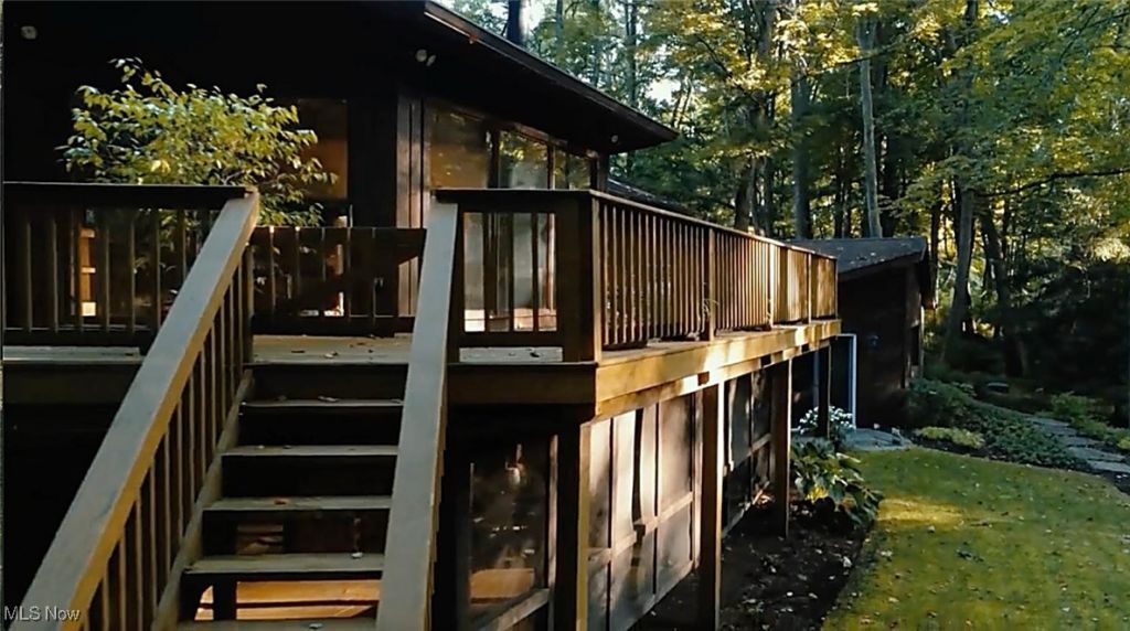 If Colorado ever claimed a spring retreat in Ohio, this would be it. Set on just over five wooded acres along storybook Griswold Creek, the entire property comes alive this time of year. Fresh greens start to push through the forest floor, sunlight filters a little longer each evening, and the sound of the creek becomes the constant backdrop?steady, calming, and quietly energizing. The landscape feels like it's waking up alongside you. Trees begin to leaf out, wildlife returns in rhythm, and every day brings a subtle shift?something new to notice, something just starting to bloom. Inside, the home unfolds across more than 6,000 total finished square feet with a ranch-style layout that lives beautifully on one level, plus a fully finished walkout lower level with in-law suite?ideal any of your extended stay needs. The 1st floorl includes the primary suite with water views, a dedicated office, 1st floor laundry, and 2 guest bedrooms that share a full bath?offering everyday functionality without sacrificing flow. Vaulted ceilings crown the great room, where one of the home's most striking architectural features takes center stage?the open-sided fireplace surrounded by walls of glass. It's equal parts sculpture and gathering place, framing views of the wraparound deck, towering trees, and the creek beyond. A wraparound main-level deck and lower-level screened porch invite year-round outdoor living, from snowy mornings with coffee to summer evenings lit by fireflies flickering in the trees that surround you. With some major updates already done: (new roof '25, a new Kinetico water system '25, and 2 new hot water tanks '25), you can simply enjoy the setting and decide, at your own pace, how to make it yours. This is a home with rock-solid construction, thoughtful proportions, and a layout and location that's increasingly hard to find. Live comfortably as-is and enjoy its retro character, or reimagine it with a modern vision to match the million-dollar estates around it.